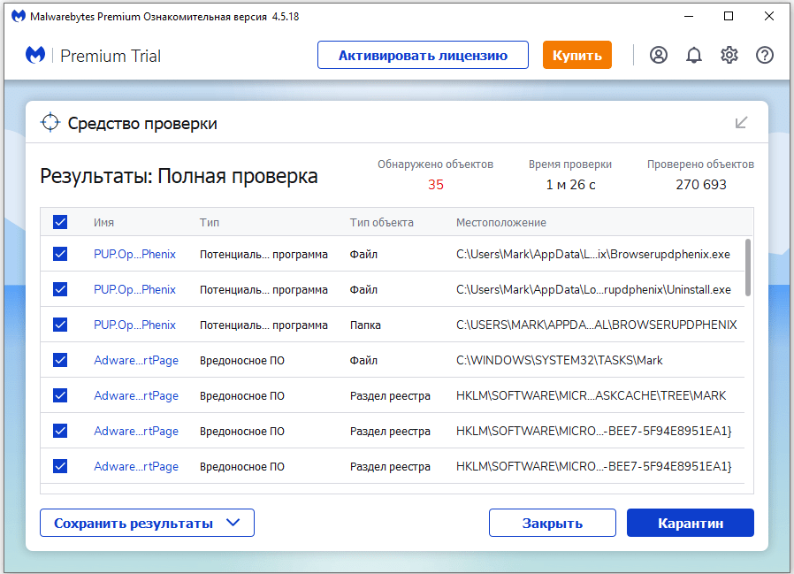 В итоге скачал Malwarebytes Free. Запустил и начал наблюдать за процессом сканирования. Было найдено три угрозы «Вредоносное ПО» (Adware.StartPage) и две «Потенциально нежелательные программы». Выделил только «Вредоносное ПО» и отправил в карантин.