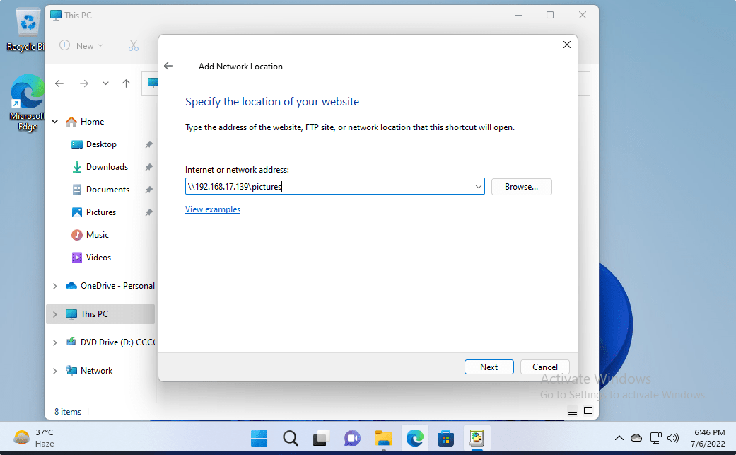 Запустится мастер добавления сетевого расположения. Продолжайте нажимать кнопку Далее, пока не появится следующий экран. Добавьте адрес ресурса Samba в соответствии с синтаксисом и нажмите Далее.