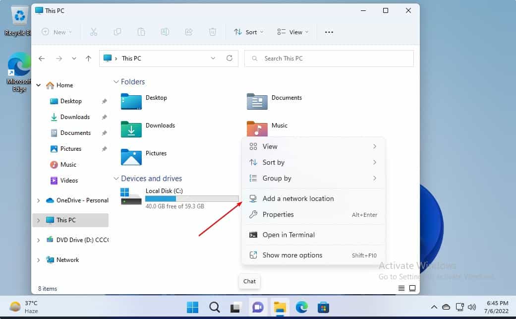Запустите Проводник в окне Window. На левой панели щелкните правой кнопкой мыши на Этот компьютер (This PC). Затем выберите Добавить сетевое расположение из выпадающих опций.