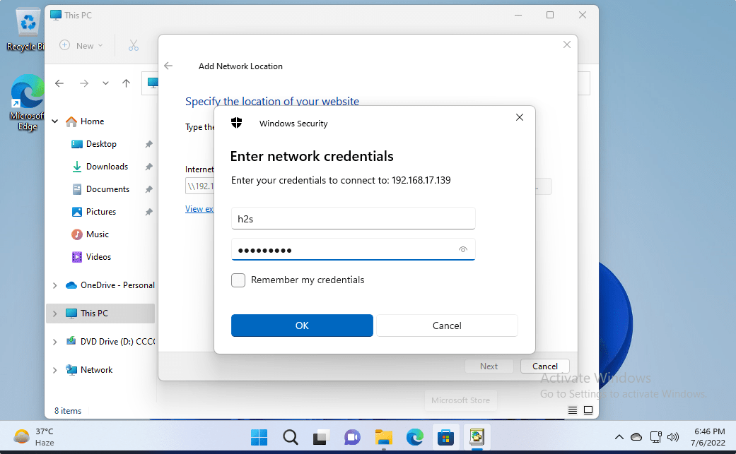 После завершения процесса появится запрос на ввод учетных данных, введите учетные данные для общего ресурса Samba и нажмите OK.