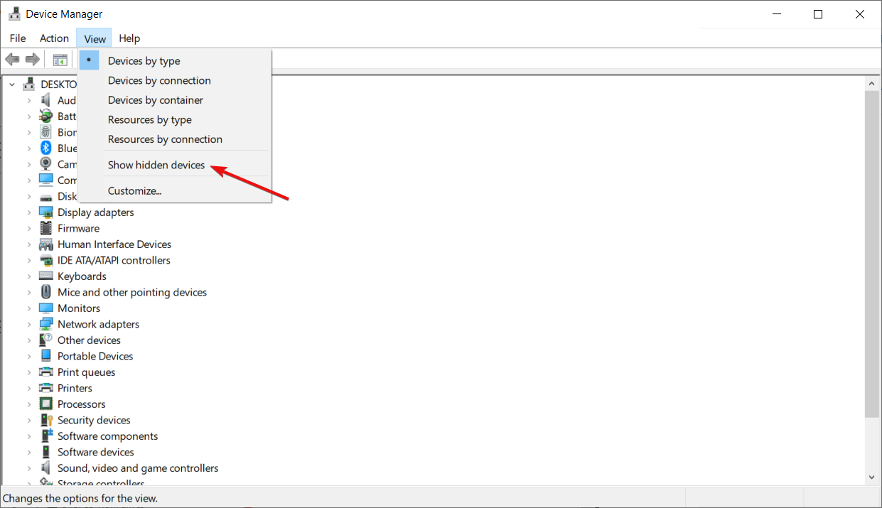 2. На главной панели нажмите Вид и выберите Показать скрытые устройства.