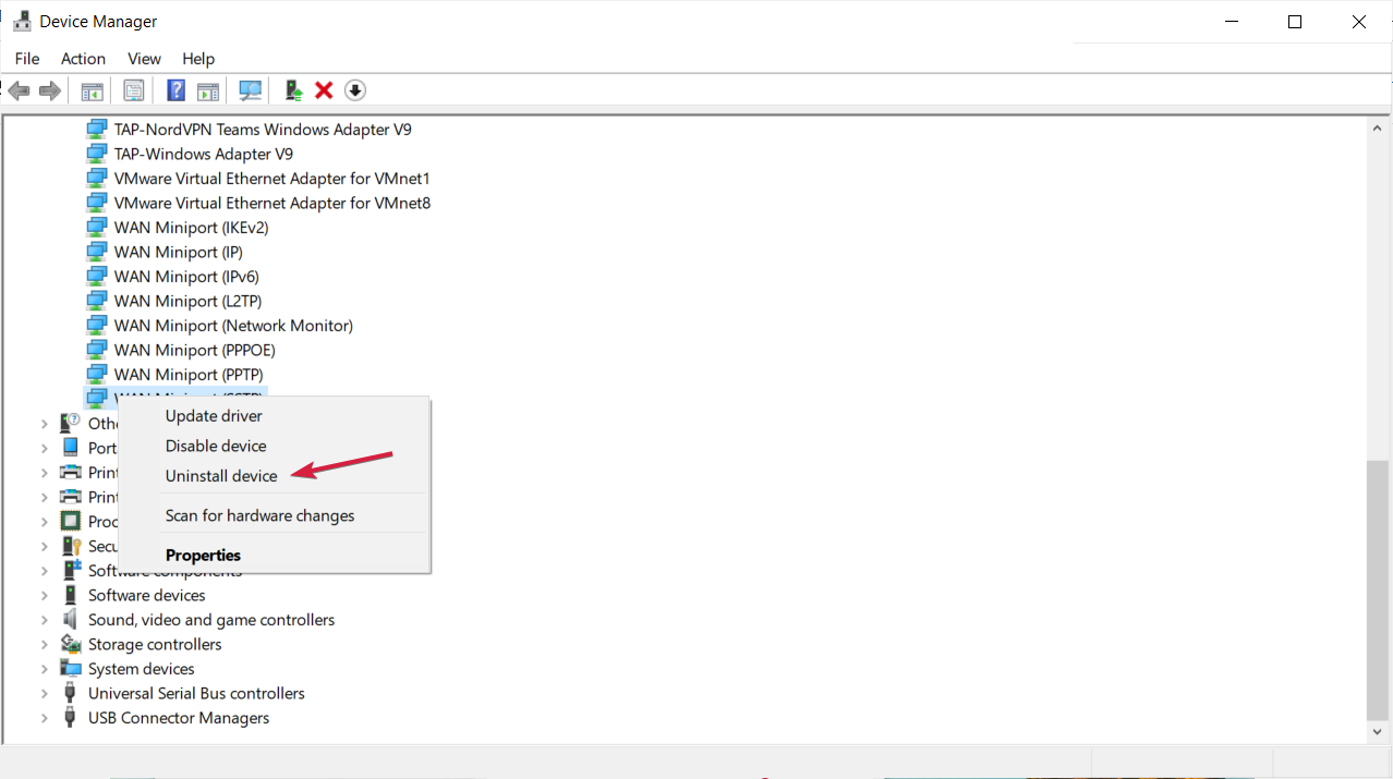 3. Развернуть Сетевые адаптерыщелкните правой кнопкой мыши каждую запись здесь и выберитеУдалить устройство.
