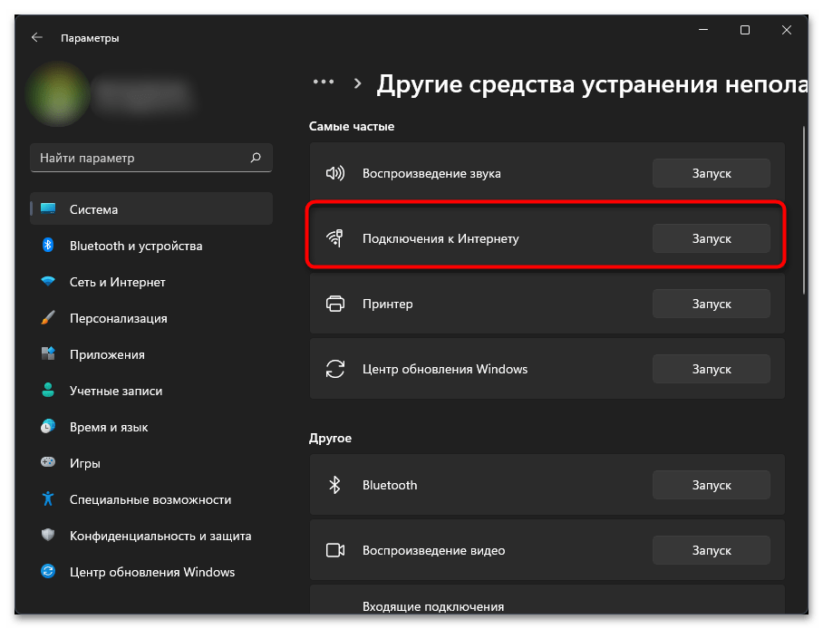 Инструмент исправления работы сети находится в списке самых частых и называется «Подключения к Интернету». Вам понадобится нажать кнопку «Запуск», чтобы начать проверку.