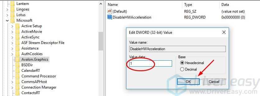 5) Дважды щелкните на DisableHWAcceleration и установите его значение на 1 чтобы отключить аппаратное ускорение в Windows 10. Нажмите Хорошо чтобы сохранить настройку.