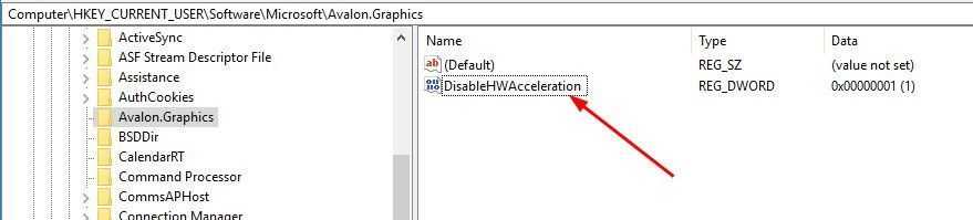 Примечание. Если вы не видите DisableHWAcceleration, создайте его:
