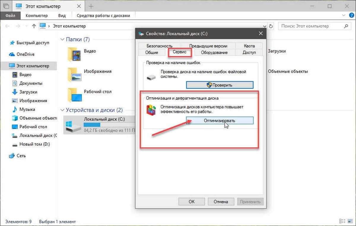 - Перейдите на вкладку «Сервис» в окне свойств диска. и нажмите кнопку «Оптимизировать» в разделе «Оптимизация и дефрагментация диска».