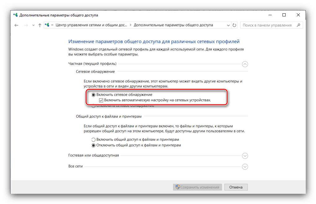 Чаще всего источником проблемы является некорректно настроенный общий доступ. Процедура для Виндовс 10 не слишком отличается от таковой в более старых системах, но имеет свои нюансы.