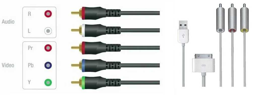 К совсем старым телевизорам айфон можно подключить при помощи композитного и компонентного кабеля. Первый представляет собой пучок из 5 штекеров на одном конце шнура, они используются для передачи видео и аудиосигнала. Второй имеет три провода на одном конце и штекер для подключения к смартфону на другом.