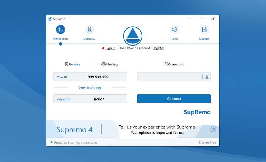 Использование этого программного обеспечения действительно доступно каждому, что делает его идеальным решением как для удаленной помощи, так и для работы на дому. Для установления соединения необходимо запустить SupRemo на вашем устройстве и на управляемом устройстве и ввести в программном интерфейсе идентификационный код и пароль, видимые на устройстве-контроллере.
