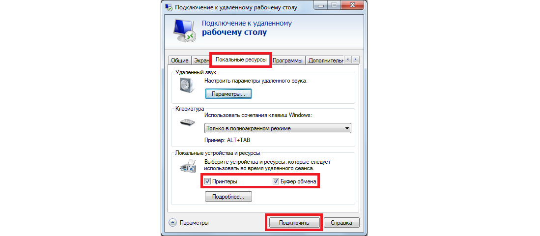 Важно, чтобы вы имели возможность работать не только с папками и файлами, а еще и с устройствами, подключенными к компьютеру, над которым будет осуществляться управление. Поэтому в выпавшем окне перейдите на вкладку «Локальные ресурсы» и поставьте там галочки напротив пунктов «Принтеры» и «Буфер обмена»