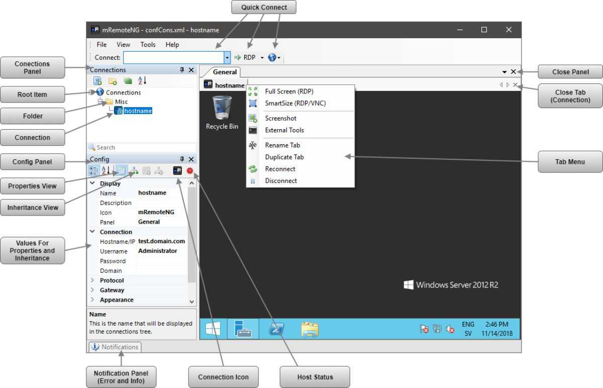 mRemoteNG это открытый, многоудаленный, многопротокольный менеджер удаленных подключений нового поколения с вкладками и протоколами для Windows. Это позволяет визуализировать все удаленные подключения в мощном, но простом интерфейсе с вкладками.