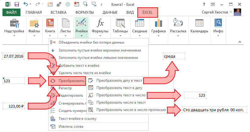 Выделите ячейки, которые Вы хотите преобразовать. Выберите в меню надстройки ЁXCEL команду «Преобразовать» и воспользуйтесь любой из 5 команд. Вот пример работы некоторых из них.