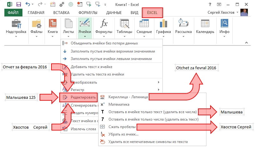Выделите ячейки, которые Вы хотите отредактировать. Выберите в меню надстройки ЁXCEL команду «Редактировать» и воспользуйтесь любой из 7 команд. Вот пример работы некоторых из них.