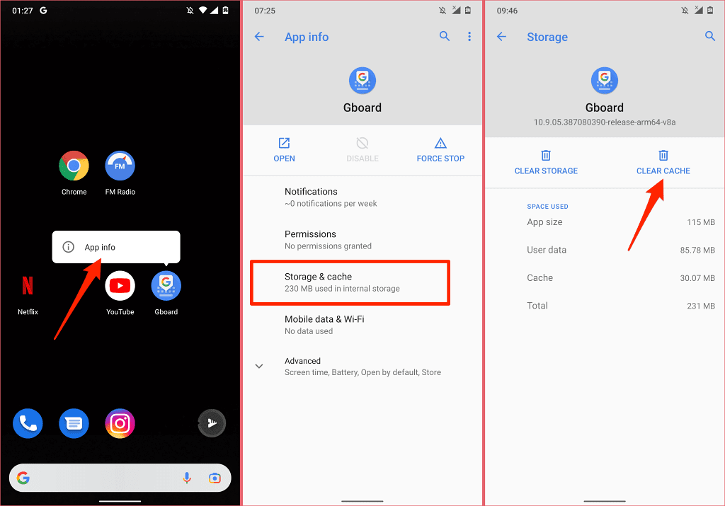 Очистите кеш(Cache) Gboard и данные приложения(App Data)