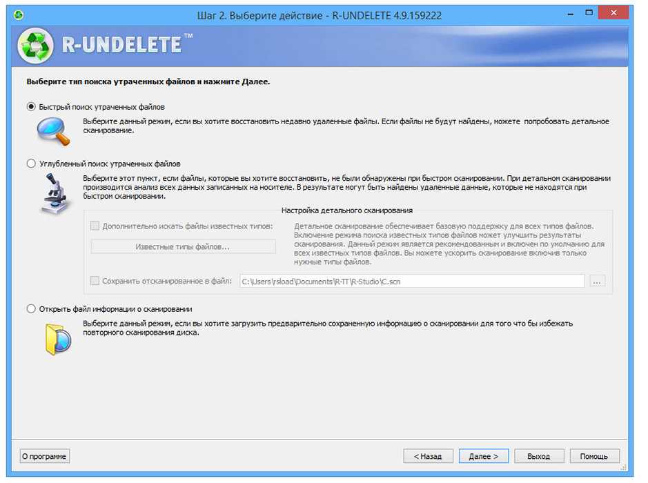 После того, как вы настроите таргетинг на один или несколько разделов, можно переходить к следующему шагу и выбрать используемый метод сканирования. R-Undelete может выполнить быстрое сканирование, но может не найти столько документов, сколько вы ожидали бы. Кроме того, вы можете выполнить подробное сканирование, которое занимает больше времени, но шансы найти то, что вы ищете, значительно выше. Кроме того, если вы выберете подробный метод сканирования, вы можете нацелить программное обеспечение на определённые типы.