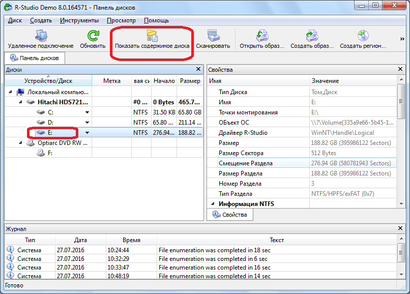 Итак, запускаем программу. Для начала нам нужно просканировать тот раздел на жёстком диске, на котором ранее хранился наш удалённый файл. Выделяем в окне программы этот раздел (см. скриншот) и нажимаем вверху на «Показать содержимое диска».