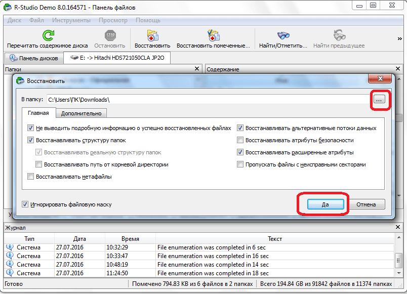 Далее откроется окошко с предложением задать параметры восстановления. Пока оставим все настройки по умолчанию, укажем лишь папку на жёстком диске, куда мы собираемся сохранить восстанавливаемый нами файл. После этого нажимаем на кнопку «Да», запустив процесс восстановления.