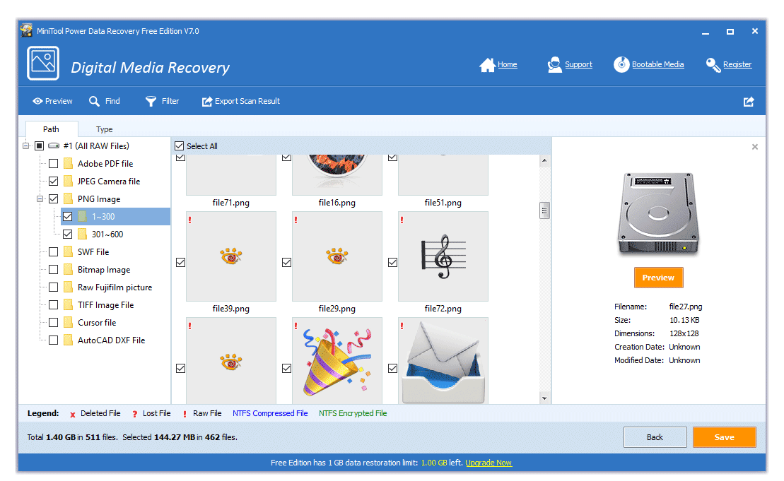 Когда мы заходим в интерфейс, видим пять папок, содержащих разные картинки в разных же форматах. Но, так как мы выбрали больше, почему отображается только 5 папок? Это все признак работы мощного фильтра MiniTool Power Data Recovery — то есть, отображаются только желаемые и доступные типы данных. Установить фильтр для восстановления можно через настройки (кнопка Settings в нижней части окна Power Data Recovery).
