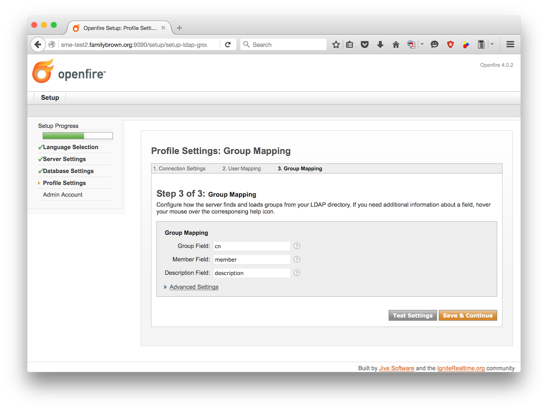… и нажимаем Тестовые настройки — мы должны увидеть информацию о группах, которую сможет получить Openfire. Кликаем Сохранить и продолжить.