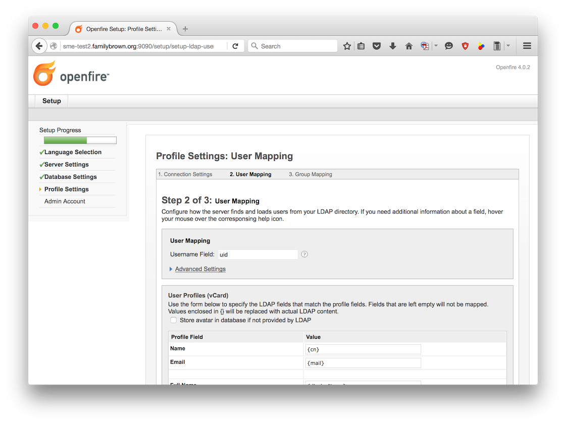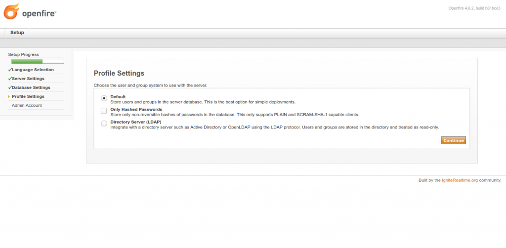 Openfire can be configured to authenticate users through your SME Server’s OpenLDAP server. This will allow you to use a single user and password source, rather than needing to maintain two or more separate databases. This is recommended unless you have a particular reason to want a separate user list for your Openfire installation. To begin, on the Profile Settings screen, select Directory Server (LDAP):