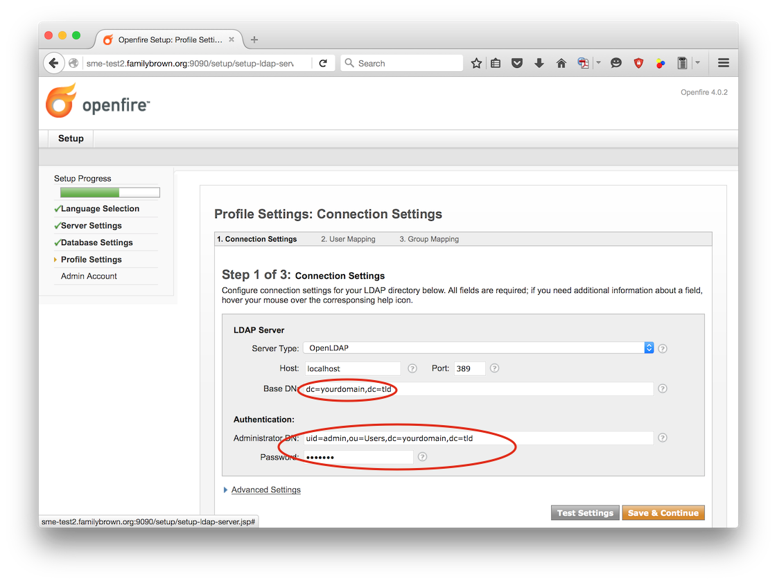 Fill in the Connection Settings screen as shown below, replacing yourdomain and tld with your primary domain name and top-level domain, as appropriate. For example, if your domain were example.com, you’d enter dc=example,dc=com. For the password field, enter your admin user’s password.