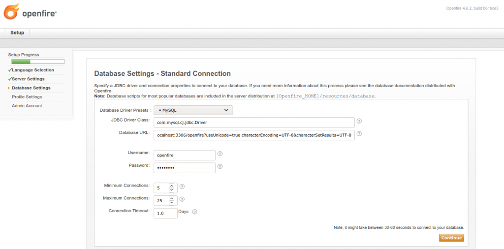 In this step, you have to configure the database connection. Select MySQL and in the url modify the values of hostname and database name.