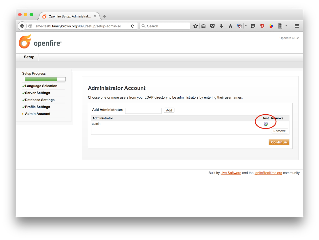 On the next page, your admin account will be listed. Click the Test button to confirm that it will authenticate this account.