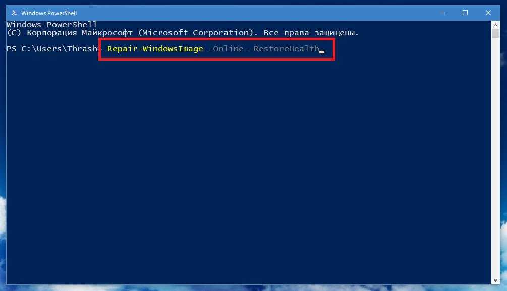Если результат снова нулевой, в работающей системе из меню «Выполнить» запустите консоль PowerShell, используя для этого одноименную команду, и выполните в ней восстановление путем исполнения сочетания, представленного ниже.