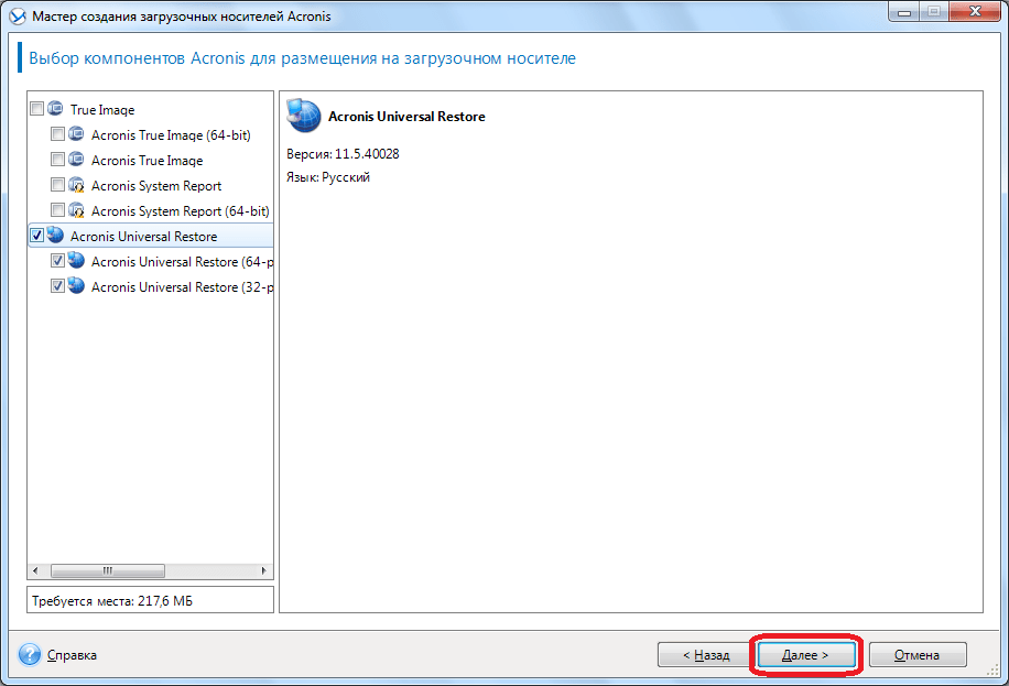 На следующем этапе следует выбрать набор компонентов для установки на загрузочном диске. Выбираем Acronis Universal Restore. Жмем на кнопку «Далее».
