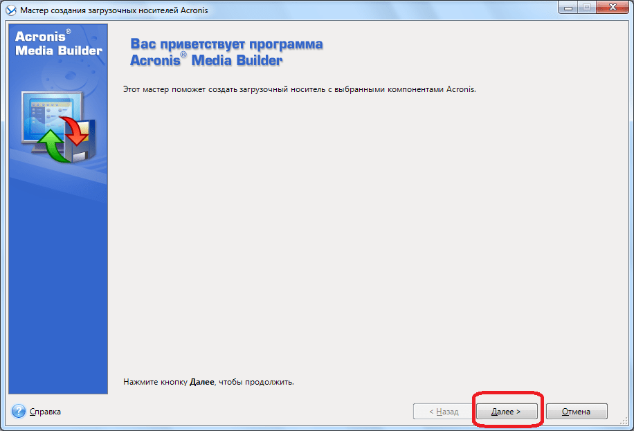 После того, как компонент установлен, возвращаемся в раздел «Инструменты» программы Acronis True Image, и опять переходим по пункту «Acronis Universal Restore». Открывается приветственное окно «Мастера создания загрузочных носителей». Кликаем по кнопке «Далее».