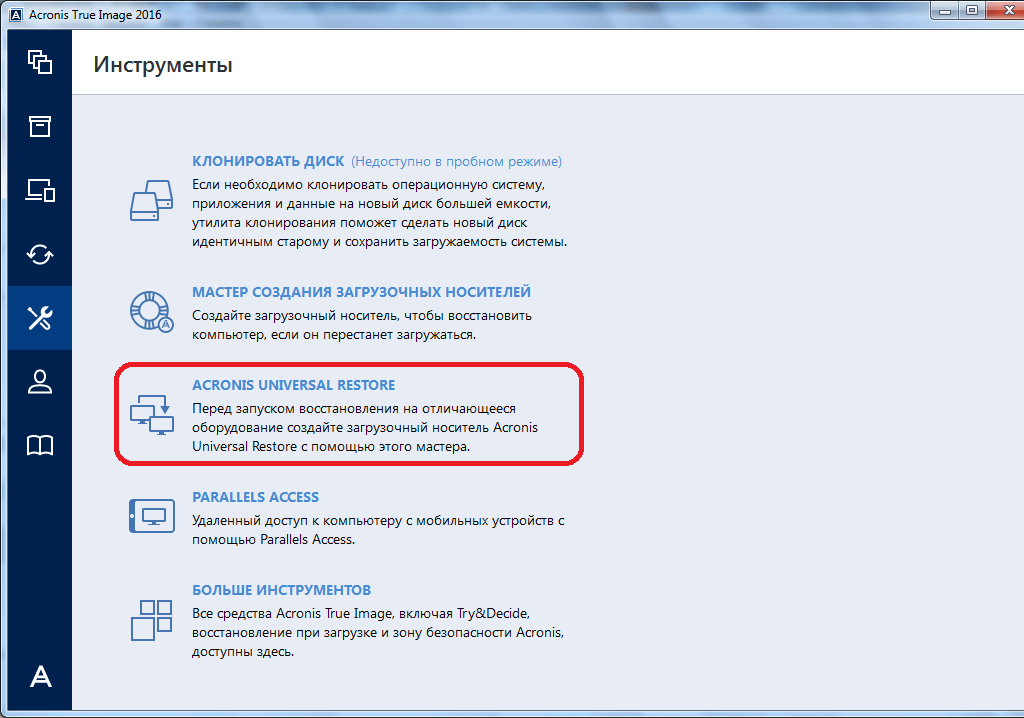 - Для создания универсального загрузочного носителя Universal Restore, перейдя в раздел инструменты, выбираем пункт «Acronis Universal Restore».