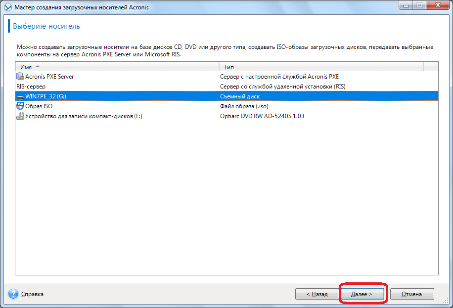 Следующий этап — выбрать накопитель, на который будет производиться запись (если это флешка, желательно ее заранее отформатировать в FAT32) или создать ISO, если вы планируете в дальнейшем записать загрузочный диск Acronis.