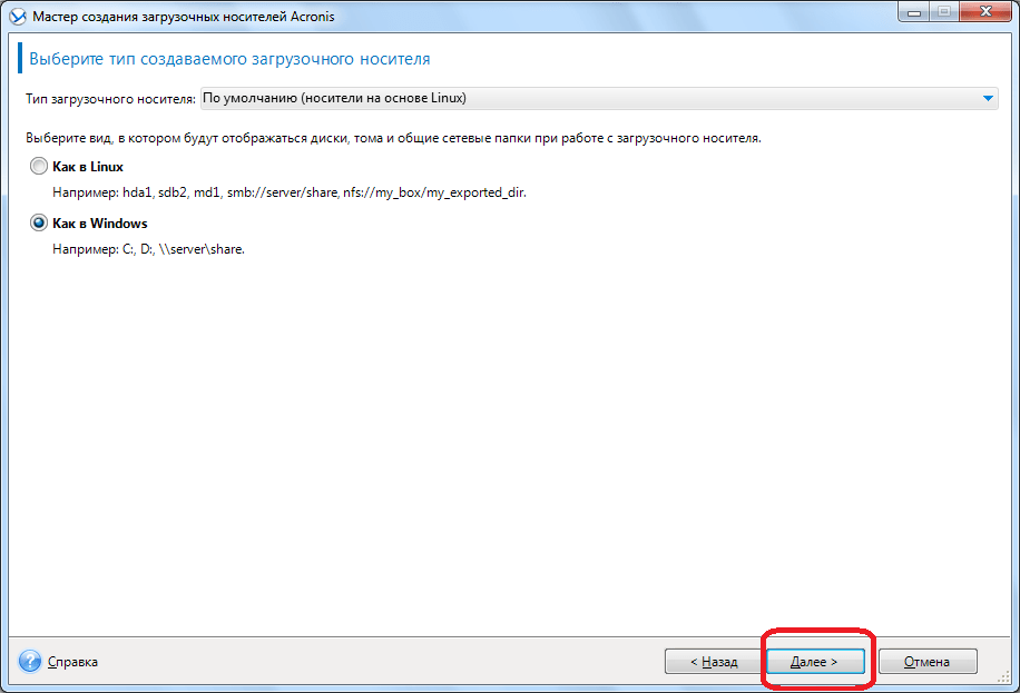 Нам предстоит выбрать, как будут отображаться пути в дисках и сетевых папках: как в операционной системе Windows, или как в Linux. Впрочем, можно оставить значения по умолчанию. Делаем клик по кнопке «Далее».