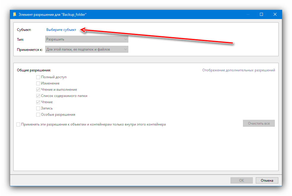 В следующем окне нажмите «Выберите субъект» и найдите свое имя пользователя так же, как на первом этапе в 4-м пункте. Установите полные права доступа для этого пользователя и нажмите «Ок».