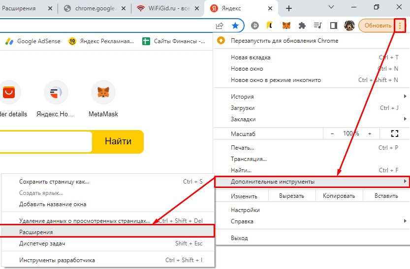 - В Google Chrome открываем основное меню, заходим в «Дополнительные инструменты» – «Расширения».