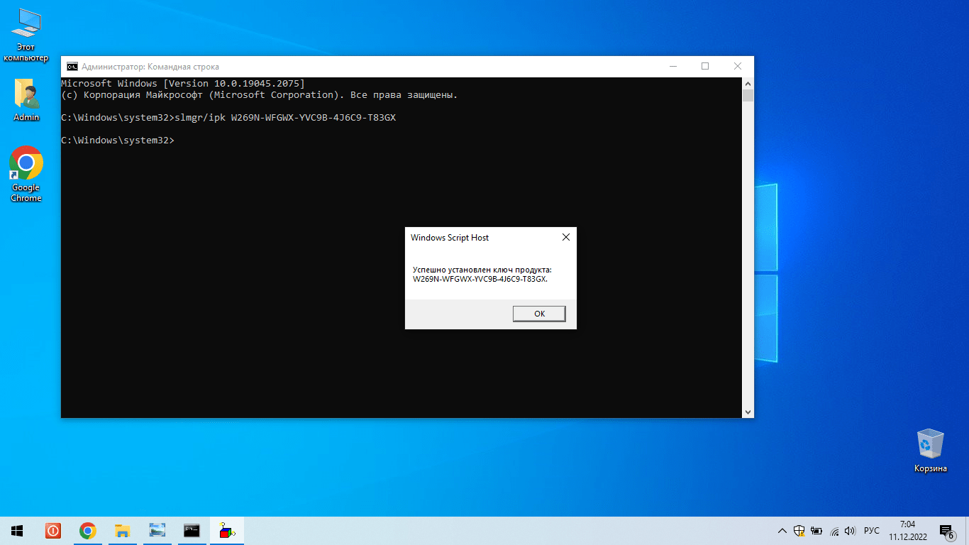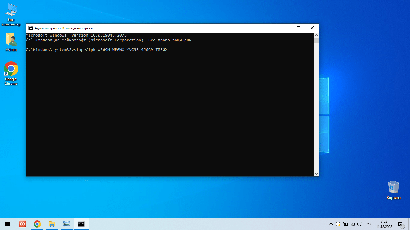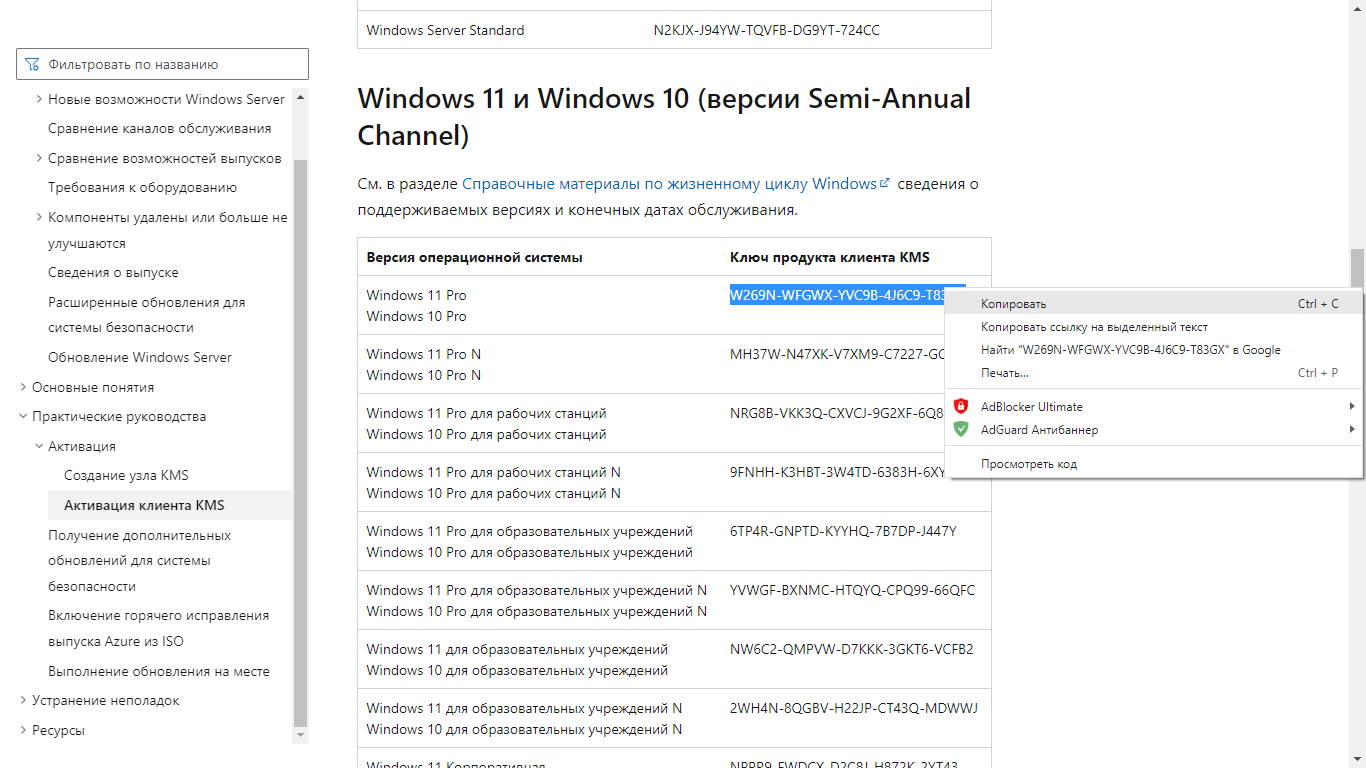 Выбираем подходящий ключ для нашей установленной версии Windows, например Windows 11 Pro или Windows 10 Pro, копируем Ключ W269N-WFGWX-YVC9B-4J6C9-T83GX и вставляем в командной строке, после ipk через пробел (Рис.7).