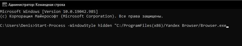 - Введите команду «Start-Process -WindowStyle hidden «C:/ProgramFiles(х86)/Yandex Browser/Browser.exe»», где вместо «C:/ProgramFiles(х86)/Yandex Browser/Browser.exe» укажите расположение исполняемого файла приложения.