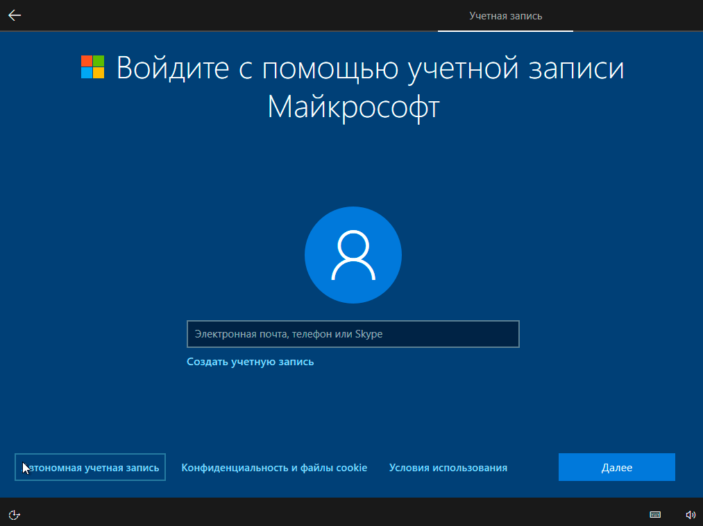 Создайте или зайдите по уже существующей учетной записи. Можно пропустить кнопкой «Автономная учетная запись» в левом нижнем углу экрана.