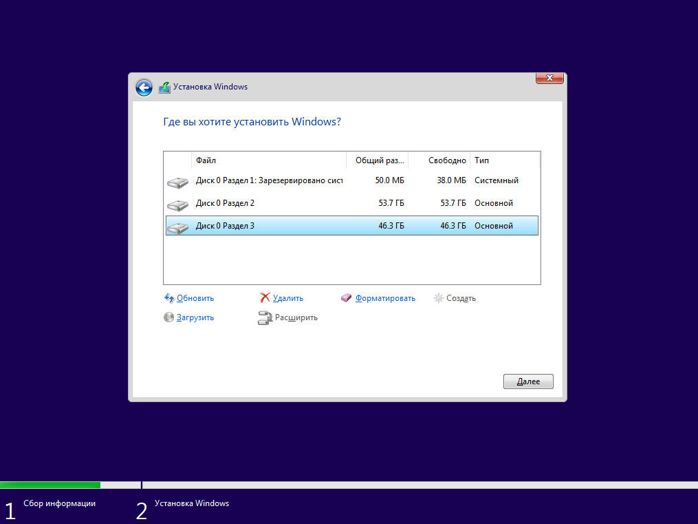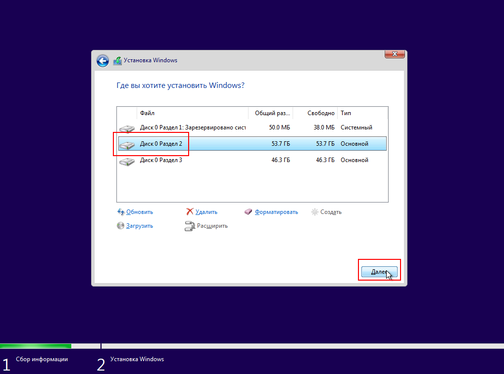 Выберите «Раздел 2», чтобы установить Виндовс на основной тип раздела (будущий диск C). Нажмите «Далее».