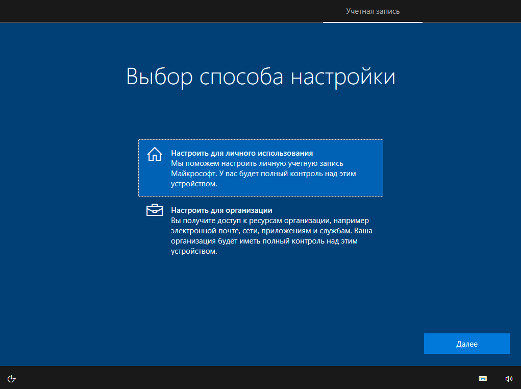 Для работы на персональном компьютере, который не подключен к локальной корпоративной сети, выберите абзац «Настроить для личного использования», после чего нажмите «Далее». С помощью второго блока будут предоставлены доступы к функциям, с помощью которых администраторы настраивают сеть организации.