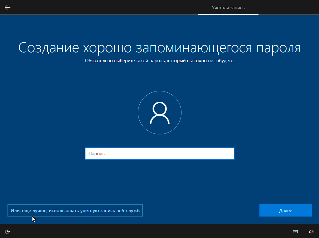 Рекомендуется придумать и ввести в рамку пароль, а после нажать «Далее». Стоит отметить, что пароль можно не использовать.