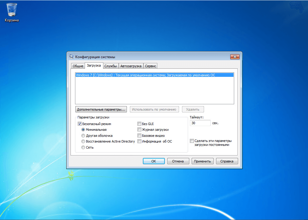 Также можно попробовать внести изменения в системный реестр посредством включения «Безопасного режима» в оснастке «Конфигурация системы».