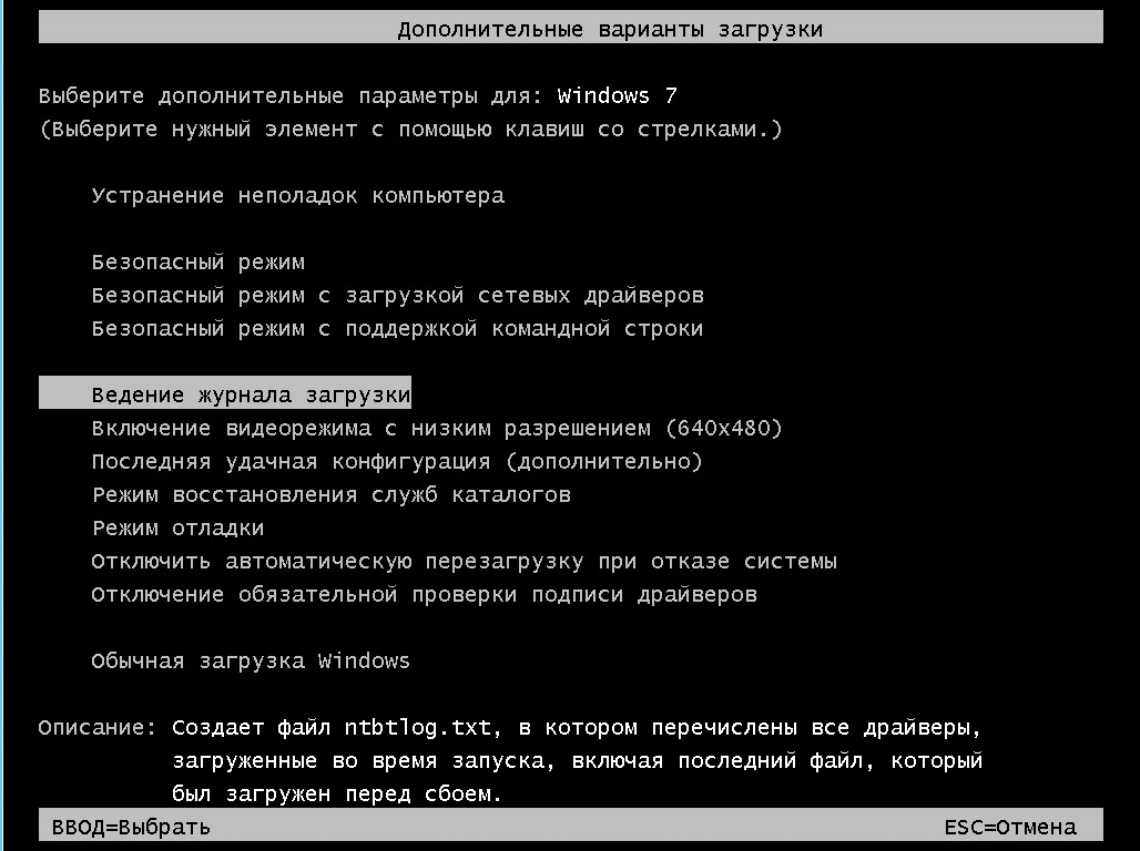 Еще из полезного это функция Ведение журнала. Она создает некий файл ntbtlog.txt, в котором перечислены все драйверы, загруженные во время запуска, включая последний файл, который был загружен перед сбоем.