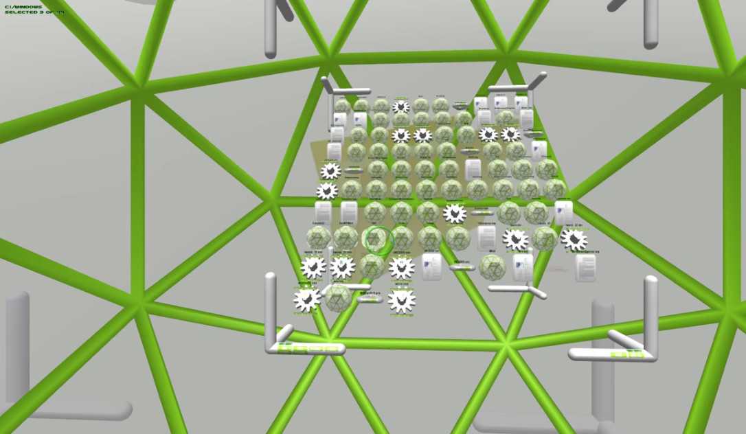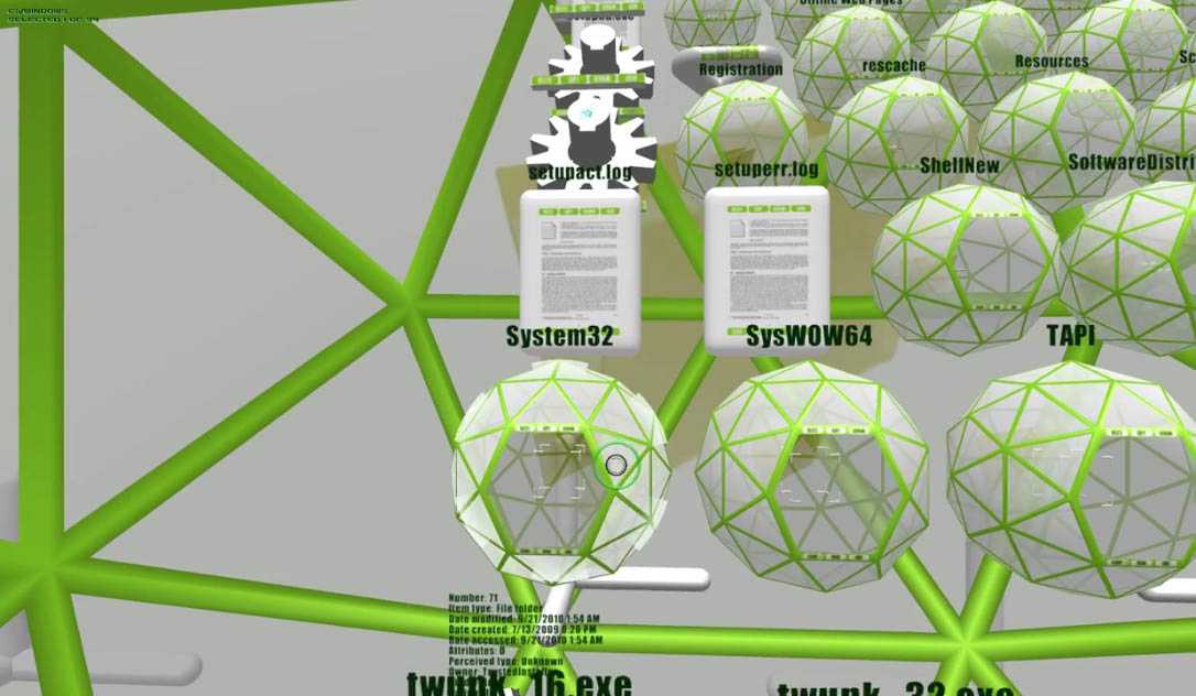 Являя собой набор трехмерных, фантастического вида моделей, оно как бы простирается вглубь, благодаря чему пользователь может «путешествовать» по этой причудливой вселенной, переходя от папки к папке, ведь заполняющие киберпространство Tactile 3D модели есть ничто иное как элементы файловой системы — ярлыки приложений, файлы и каталоги на жестком диске.