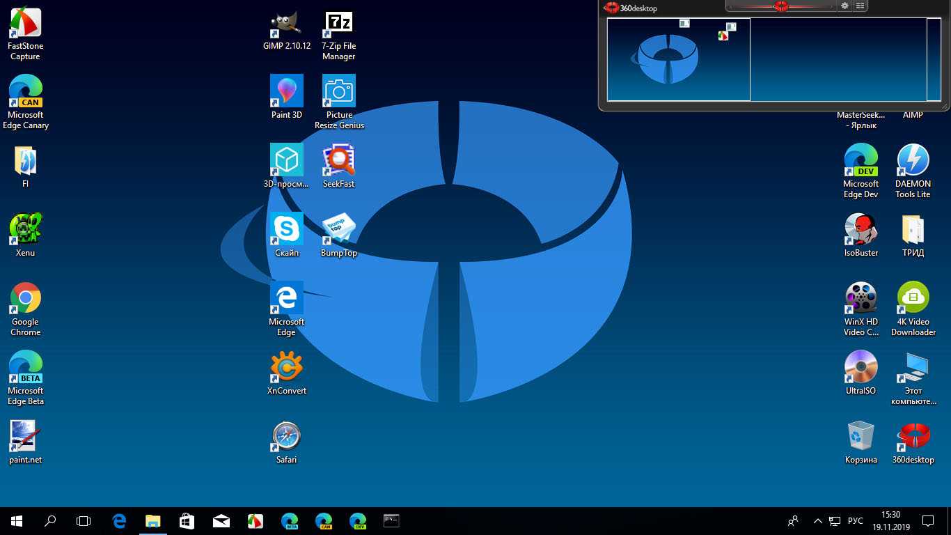 Представьте себе несколько рабочих столов, склеенных по бокам и свернутых в кольцо — именно это делает программа 360Desktop, превращая рабочий стол в горизонтальную панораму с обзором в 360 градусов с небольшой панелькой прокрутки, закрепленной в правой верхней области десктопа.
