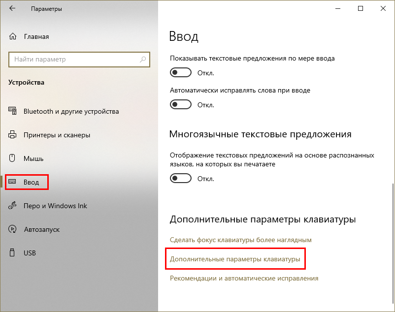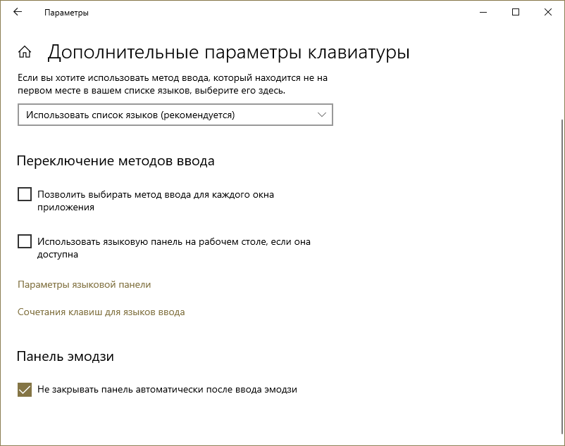 Настроек у панели очень не много, найти их можно в Параметры (клавиши Win+I) — Устройства — Ввод — Дополнительные параметры клавиатуры.