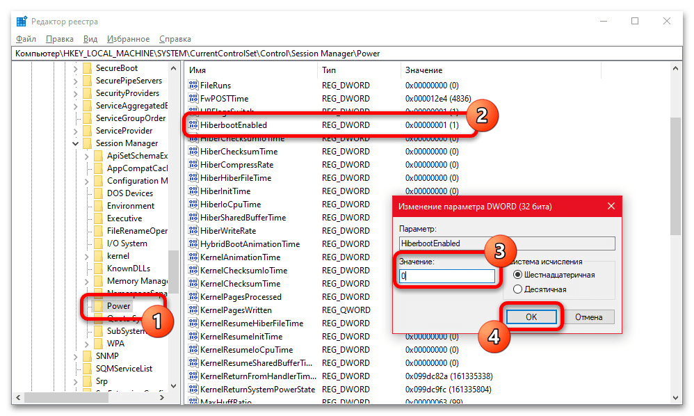 - Найдите параметр HiberbootEnabled. Он отвечает за работу быстрого запуска в Windows 10.