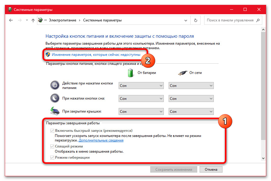 - Если опции вам недоступны, кликайте «ИзменениеПараметров, КоторыеСейчасНедоступны», расположенные в подразделе «НастройкиКнопокПитания….»;