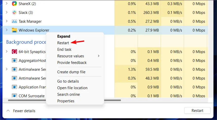 - Щелкните правой кнопкой мыши процесс и выберите параметр «Перезапустить».