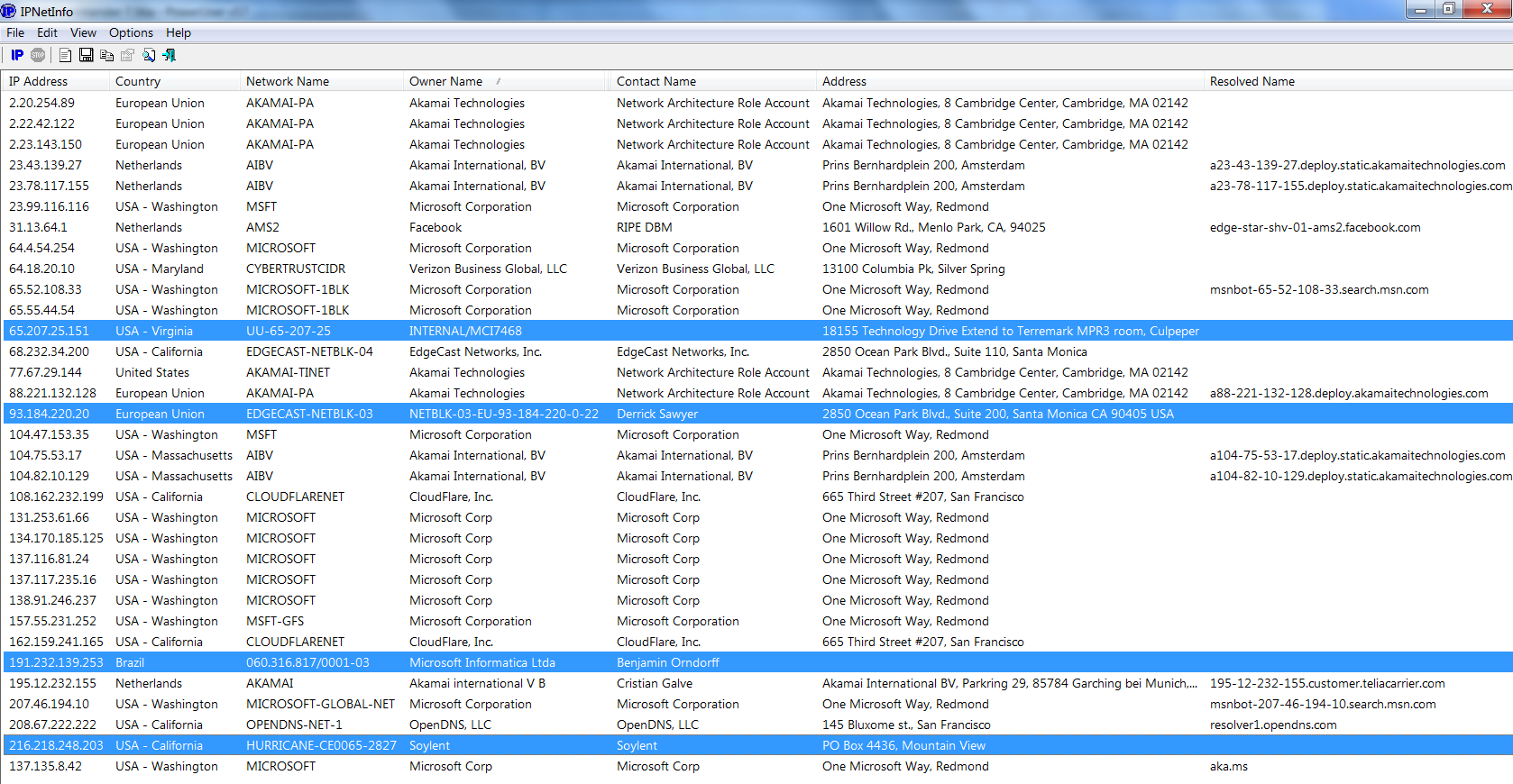 За полчаса в сеть ушло около восьми тысяч пакетов. Как показало изучение логов, большинство соединений устанавливалось по адресам в пределах одной из крупных подсетей. У принадлежащих им айпишников часто менялись два-три последних октета. Это говорит о том, что Microsoft развернула огромную сеть для обработки всей стекающейся от пользователей Windows информации. Если отсеять однотипные адреса, то в сухом остатке получится подборка как на картинке.